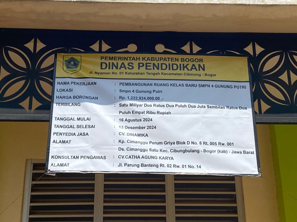 Utuk diketahui, Pembangunan SMPN 4 Gunung Putri mendapatkan pembangunan 3 ruang kelas dengan CV.Dinamika sebagai penyedia jasa dan PT. CHATA Agung Karya sebagai Konsultan Pengawas. Dengan memakan anggaran sebesar Rp.1,2 Miliar dan harus selesai pada tanggal 13 Desember 2024.