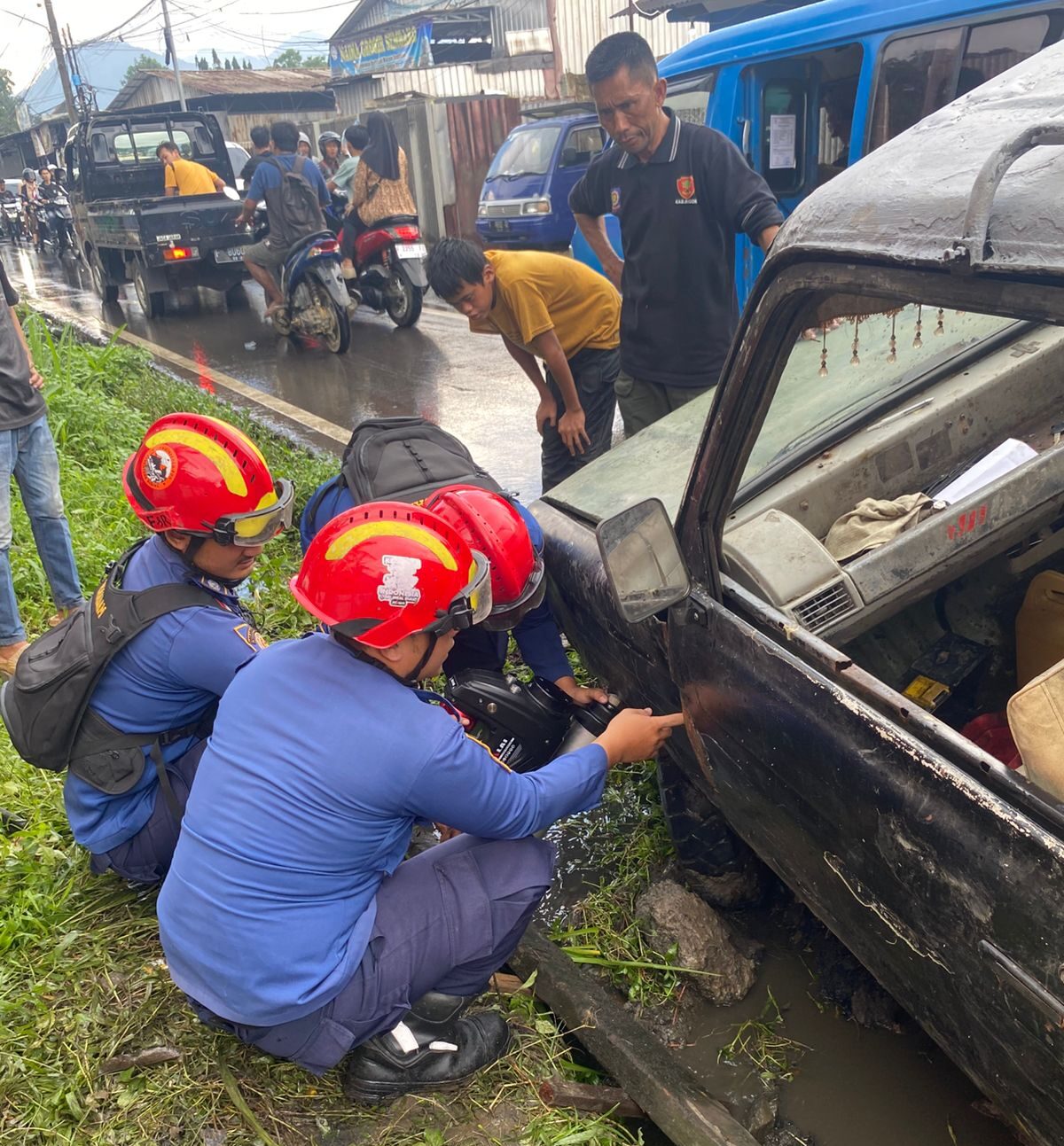 “Saat tim tiba di lokasi, kondisi mobil sudah dalam keadaan kedua ban sebelah kiri masuk ke parit dan tersangkut pada bagian gardan. Sebelumnya sudah dicoba evakuasi secara manual, namun tidak berhasil sehingga kemudian menghubungi tim damkar,” ujarnya.