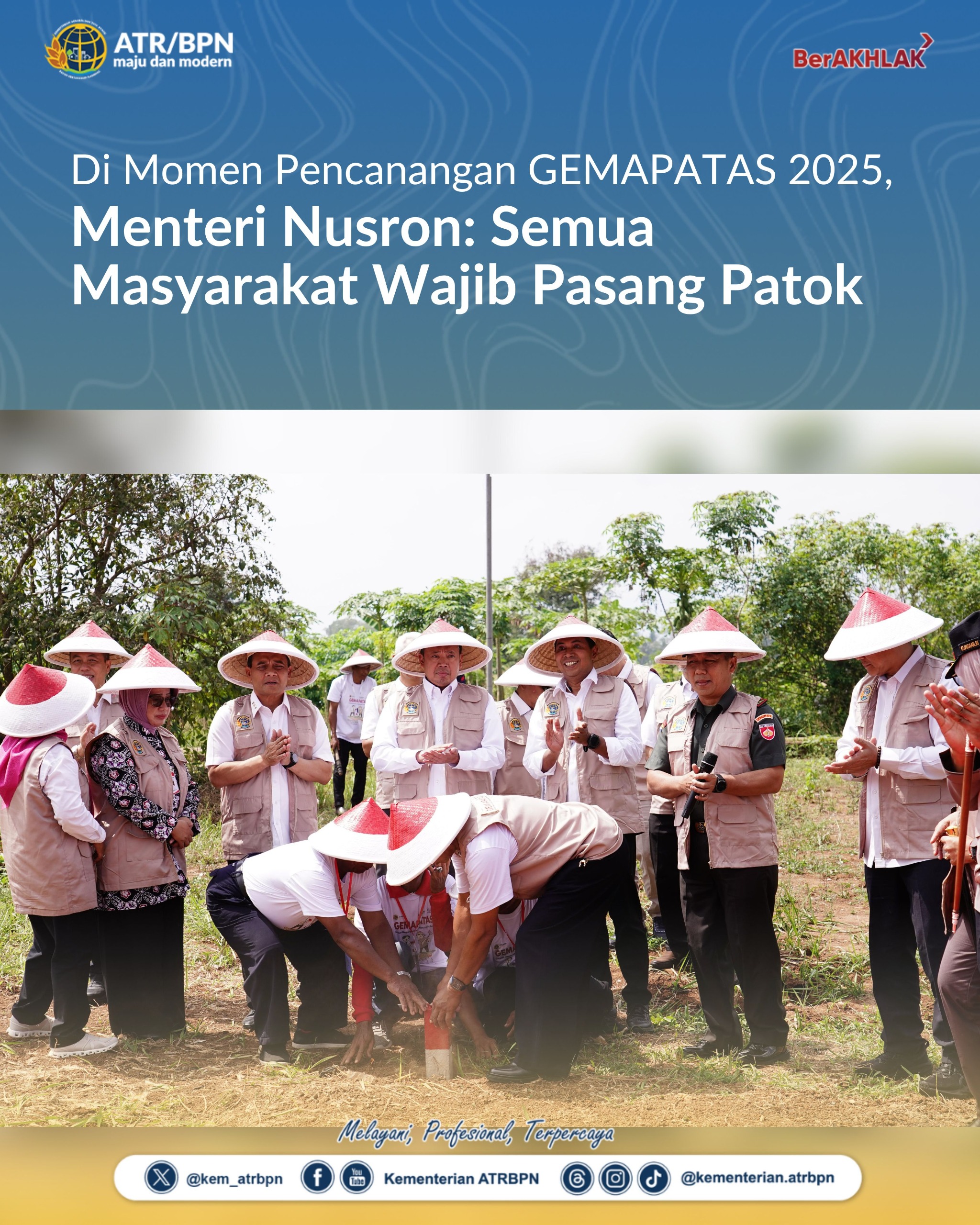 AKTUALITA.CO.ID – Menteri Agraria dan Tata Ruang/Kepala Badan Pertanahan Nasional (ATR/BPN), Nusron Wahid, menegaskan pentingnya peran serta masyarakat dalam menjaga batas tanah miliknya masing-masing. Ia menegaskan hal itu saat memimpin pencanangan Gerakan Masyarakat Pemasangan Tanda Batas (GEMAPATAS) 2025, yang digelar serentak di 23 kabupaten/kota pada 8 provinsi, dengan pusat pelaksanaan di Kabupaten Purworejo, Jawa Tengah.