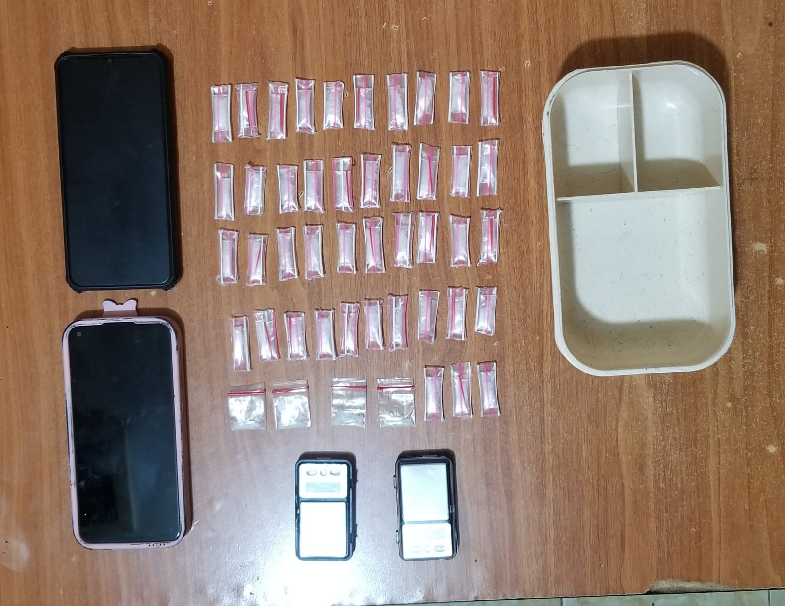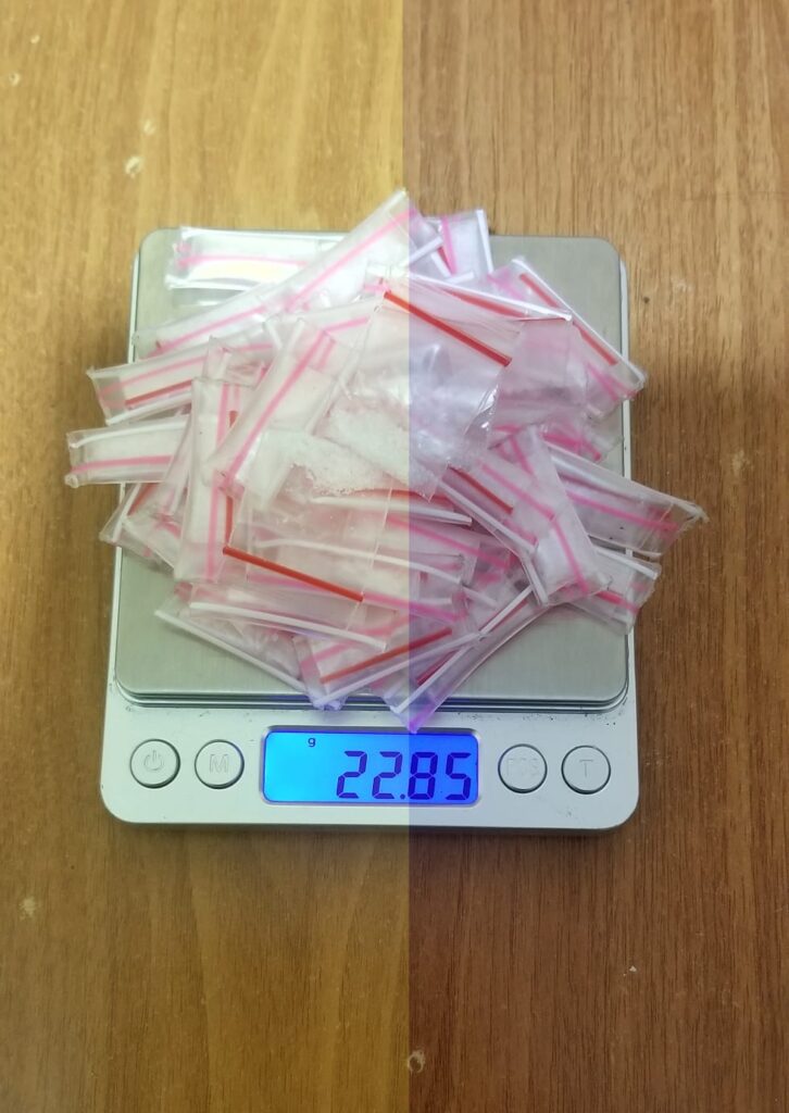 Lebih lanjut Kasat Narkoba mengatakan, Barang bukti yg diamankan meliputi 43 bungkus sedotan yang masing-masing berisi narkotika jenis sabu dan 4 bungkus plastik bening berisikan narkotika jenis Sabu dgn berat bruto 22,85 gram, jaket warna hitam, wadah makanan warna krem, 2 unit timbangan elektrik warna hitam, 2 unit handphone, dan 1 unit sepeda motor Honda Beat warna biru dengan nomor polisi F-3877-JT.