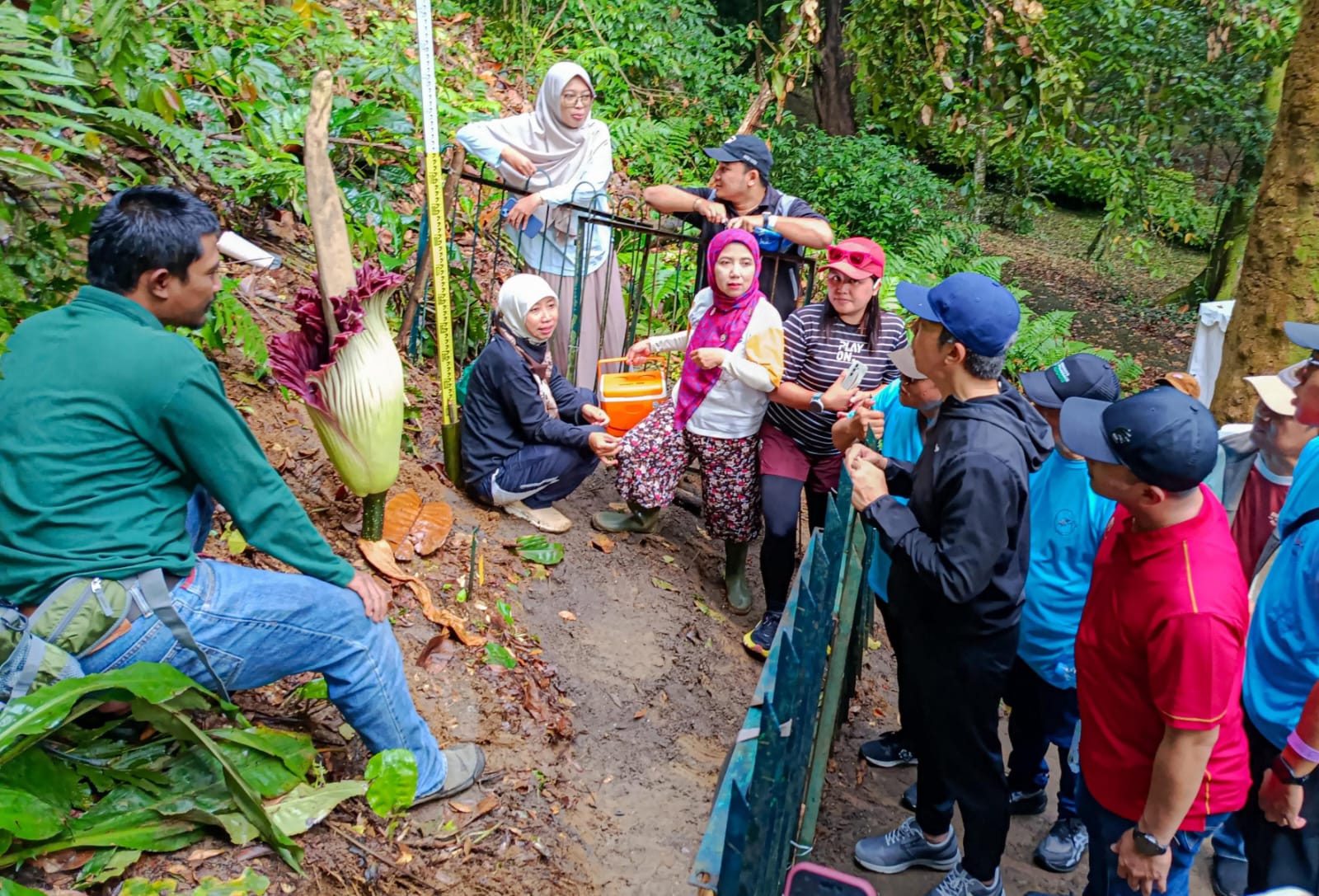 Di lokasi yang sama, sejumlah peneliti dari Badan Riset dan Inovasi Nasional (BRIN) juga terlihat melakukan pengamatan dan penelitian. Berdasarkan informasi dari para peneliti, bunga tersebut mulai mekar beberapa hari sebelumnya dan setelah mencapai puncak mekar, akan berangsur menguncup hingga akhirnya mati.