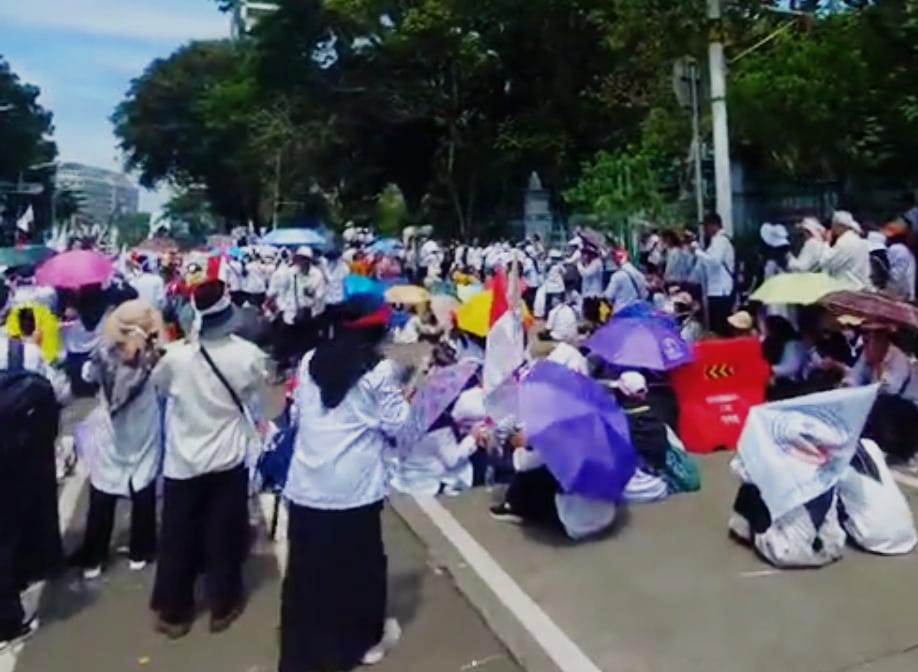 AKTUALITA.CO.ID – Ribuan guru madrasah dari berbagai daerah dan organisasi madrasah di Indonesia menggelar aksi demonstrasi di kawasan Monumen Nasional (Monas), Jakarta Pusat, Kamis (30/10/25). Mereka menuntut agar guru madrasah swasta mendapat kesempatan yang sama untuk diangkat menjadi Pegawai Pemerintah dengan Perjanjian Kerja (PPPK) atau Aparatur Sipil Negara (ASN).