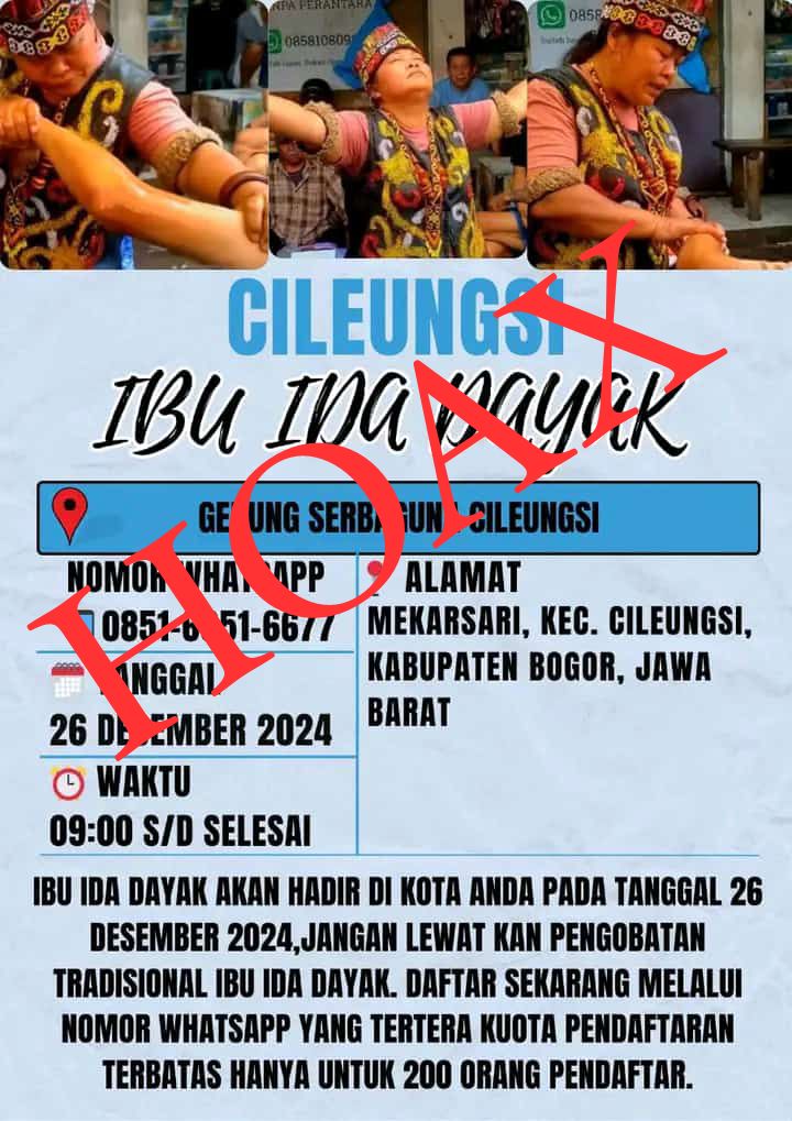 AKTUALITA.CO.ID _ Beredarnya selembaran diberbagai grup Whatsapp bahwa adanya pengobatan Ibu Ida Dayak yang akan dilangsungkan di Gedung Serbaguna Cileungsi, Kabupaten Bogor pada Tanggal 26 Desember 2024 dinyatakan tidak benar adanya.