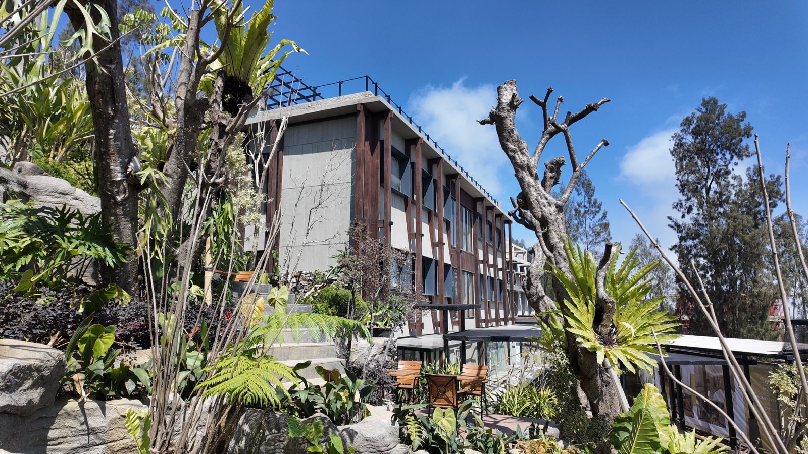 Fasad bangunan Jambuluwuk Bromo Resort & Poshtel dengan latar belakang pemandangan pegunungan yang asri
