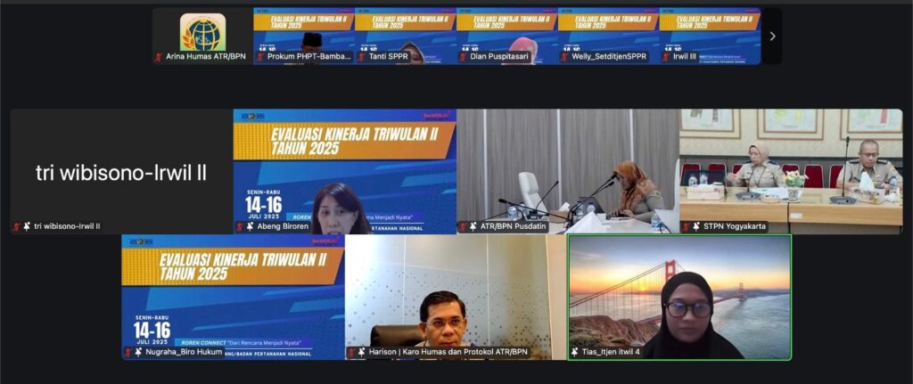 Dalam sesi monitoring dan evaluasi daring ini, turut serta Kepala Biro Hukum, Nugraha; Kepala Pusdatin, I Ketut Gede Ary Sucaya; Inspektur Wilayah II, Tri Wibisono; serta Ketua Sekolah Tinggi Pertanahan Nasional (STPN), Sri Yanti Achmad.