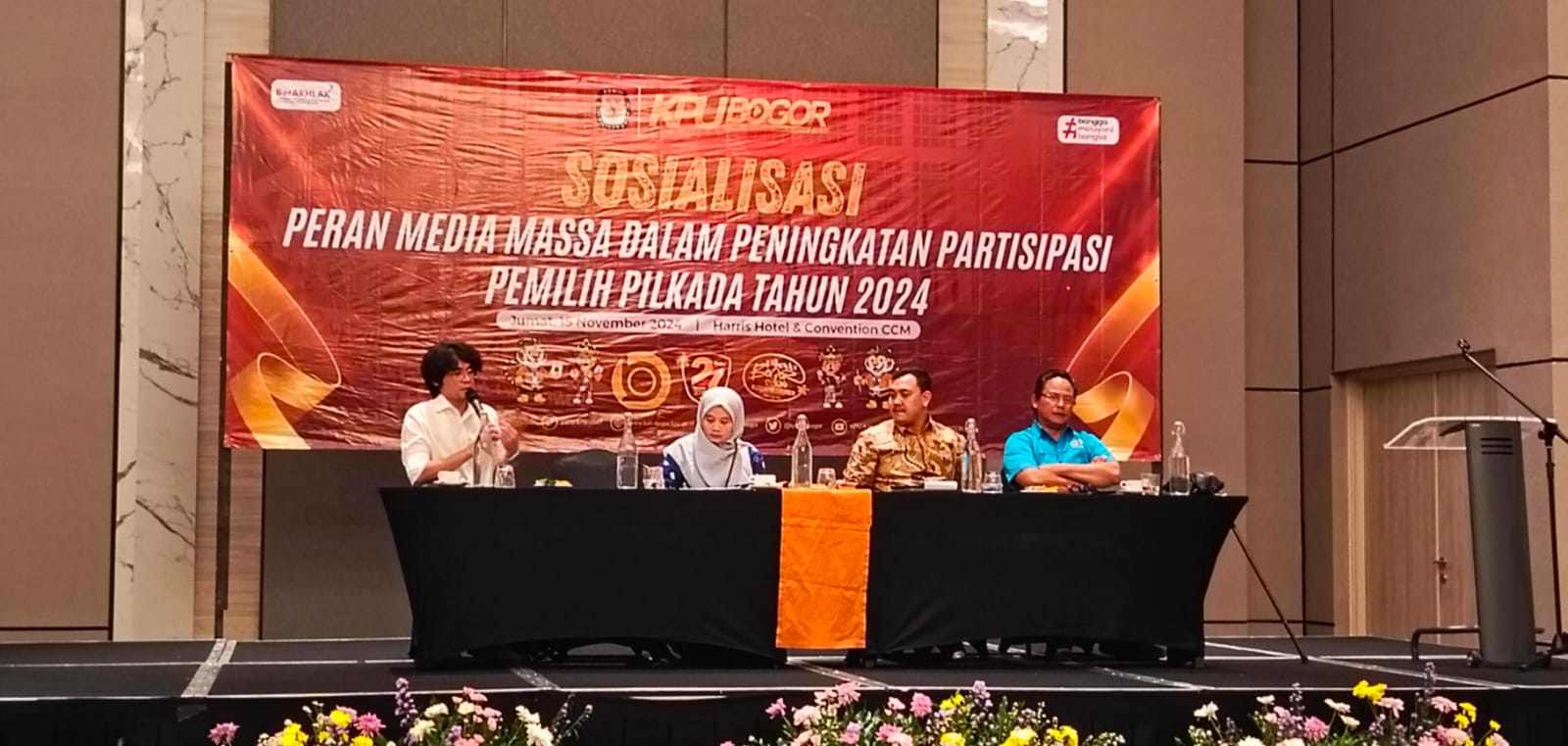 AKTUALITA.CO.ID _ Komisi Pemilihan Umum (KPU) Kabupaten Bogor menggelar sosialisasi bertema Peran Media Massa dalam Meningkatkan Partisipasi Pemilih pada Pilkada 2024 di Hotel Harris, Cibinong, Jumat (15/11). Kegiatan ini dihadiri oleh berbagai perwakilan organisasi media, termasuk Persatuan Wartawan Indonesia (PWI), Ikatan Jurnalis Televisi Indonesia (IJTI), serta sejumlah insan pers dari media lokal.
