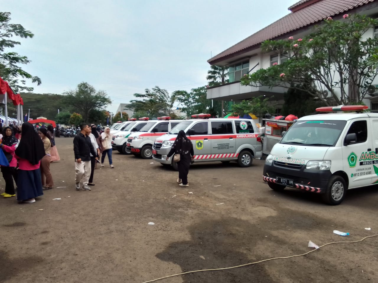 Aktualita.co.id- Beberapa Mobil Ambulance Desa terlihat bersiaga dalam kegiatan khitanan massal yang diselenggarakan oleh Karang Taruna Kecamatan Cileungsi, Kabupaten Bogor yang digelar di Gedung Serbaguna Kantor Kecamatan Cileungsi, Minggu (01/06/25).