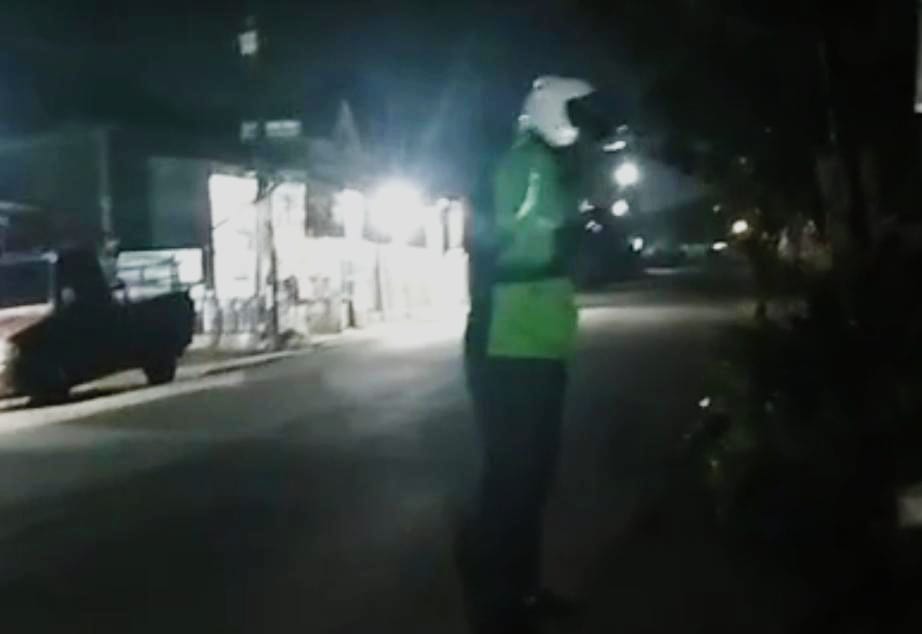 Dalam video yang beredar, tampak seorang pria mengenakan jaket ojol lengkap dengan helm. Ia terlihat mondar-mandir sambil berbicara melalui telepon genggam, menceritakan kejadian yang baru saja dialaminya kepada seseorang yang di telponnya.