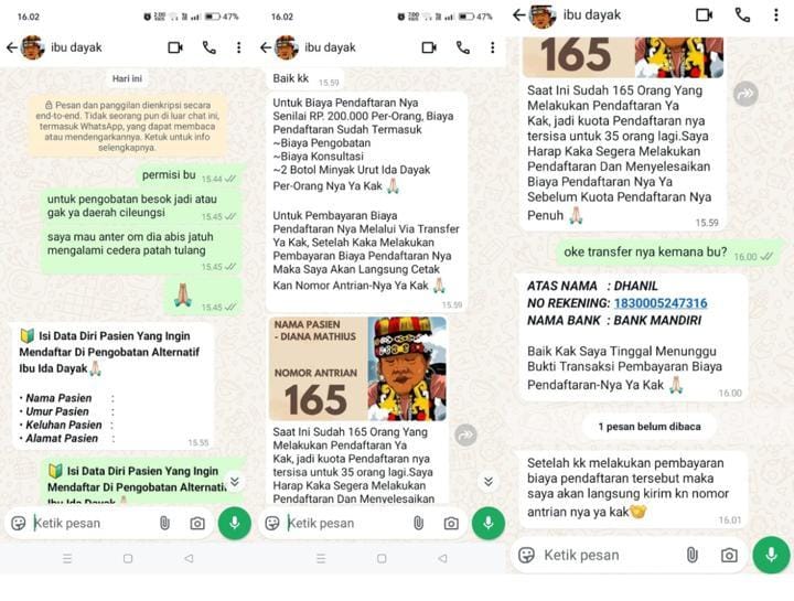 ” Karena saya mendapatkan info ada pengobatan Ibu Ida Dayak yang sempat viral beberapa waktu lalu, terus saya berniat ingin membawa om saya yang beberapa lalu mengalami cedera patah tulang. Tapi seperti ada yang janggal, saya harus transfer terlebih dahulu sebesar 200.000 ke rekening Bank Mandiri atas nama DHANIL untuk dapet nomor antrian sebelum pengobatan, karena yang saya tau itu pengobatan Ibu Dayak viral di Youtube ini membayar dengan seikhlasnya,” terang Siti kepada Aktualita.co.id. Rabu (25/12/24).