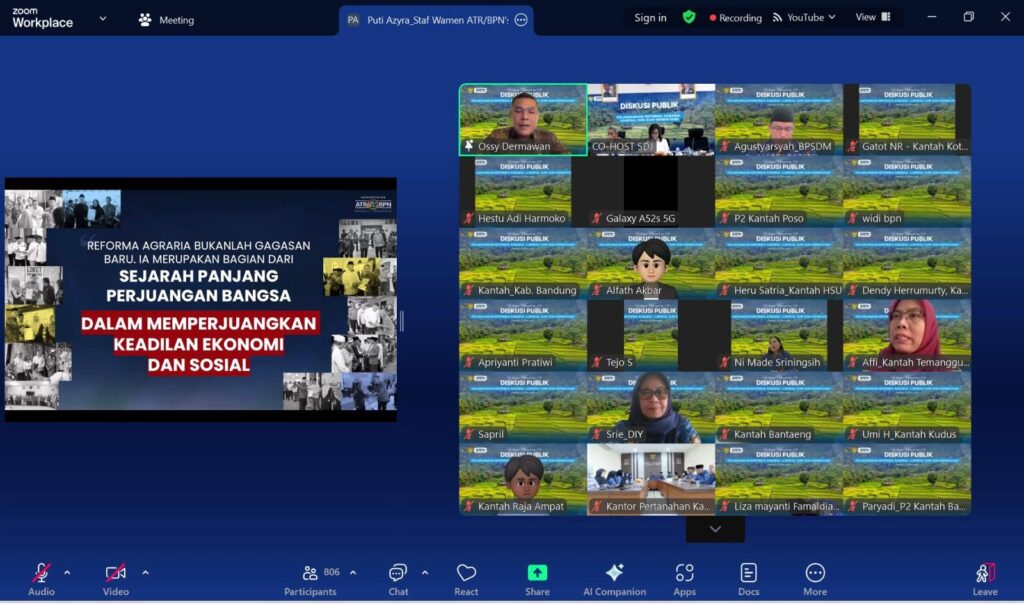 AKTUALITA.CO.ID _ Wakil Menteri Agraria dan Tata Ruang/Wakil Kepala Badan Pertanahan Nasional (Wamen ATR/Waka BPN), Ossy Dermawan, membuka Webinar Nasional Diskusi Publik “Pelaksanaan Reforma Agraria: Lampau, Kini, dan Mendatang” pada Kamis (17/07/2025). Dalam sambutannya, ia mengatakan bahwa Reforma Agraria bukan hanya tentang membagi tanah, tetapi juga tentang memperbaiki, membangun harapan, dan menciptakan keadilan yang berkelanjutan.