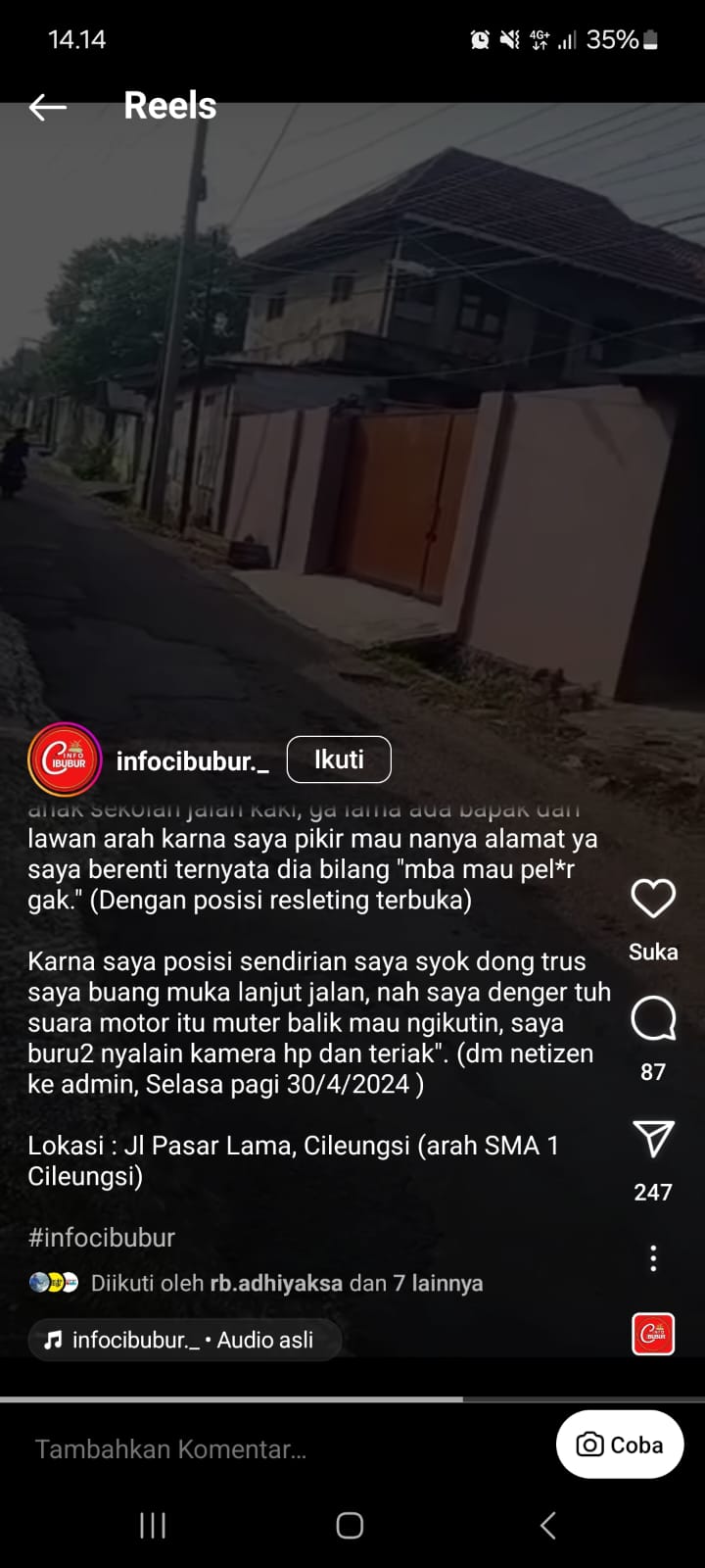 AKTUALITA.CO.ID _ Lagi, Perbuatan ekshibisionis terhadap perempuan terjadi di Jalan Raya Pasar Lama Desa Cileungsi, Kecamatan Cileungsi, Kabupaten Bogor. Jum’at (3/5/24).