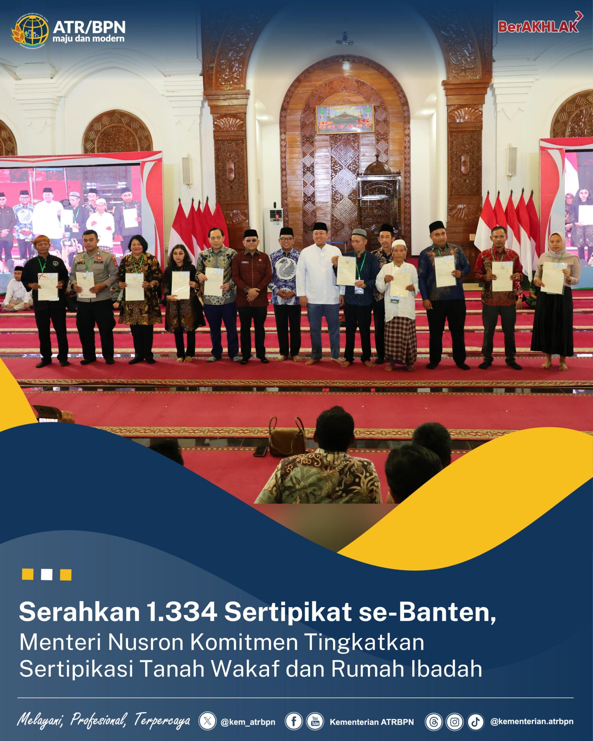AKTUALITA.CO.ID _ Menteri Agraria dan Tata Ruang/Kepala Badan Pertanahan Nasional (ATR/BPN), Nusron Wahid menyerahkan 1.334 sertipikat tanah untuk masyarakat se-Provinsi Banten pada Jumat (20/12/2024). Di momen ini, Menteri Nusron menyerahkan 12 sertipikat secara langsung kepada perwakilan penerima. Ia pun menyatakan komitmennya untuk meningkatkan sertipikasi tanah wakaf, baik itu masjid, musala, pondok pesantren, serta rumah ibadah lainnya.