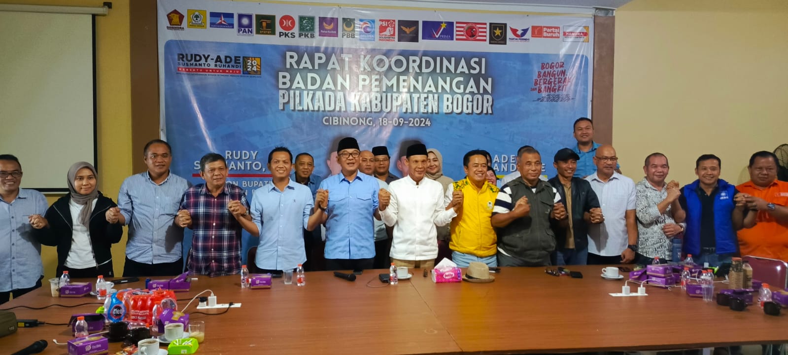 AKTUALITA.CO.ID _ H. Iwan Setiawan Ketua Tim Pemenangan Pasangan Calon Bupati Bogor Nomor Urut 01 Rudy Susmanto-Jaro Ade, menggelar konferensi pers untuk mengumumkan hasil penghitungan cepat atau quick count dalam Pilkada 2024 Kabupaten Bogor. Acara tersebut dilaksanakan di Sekretariat Bersama Partai Gerindra, Cibinong, Rabu (27/11/24).